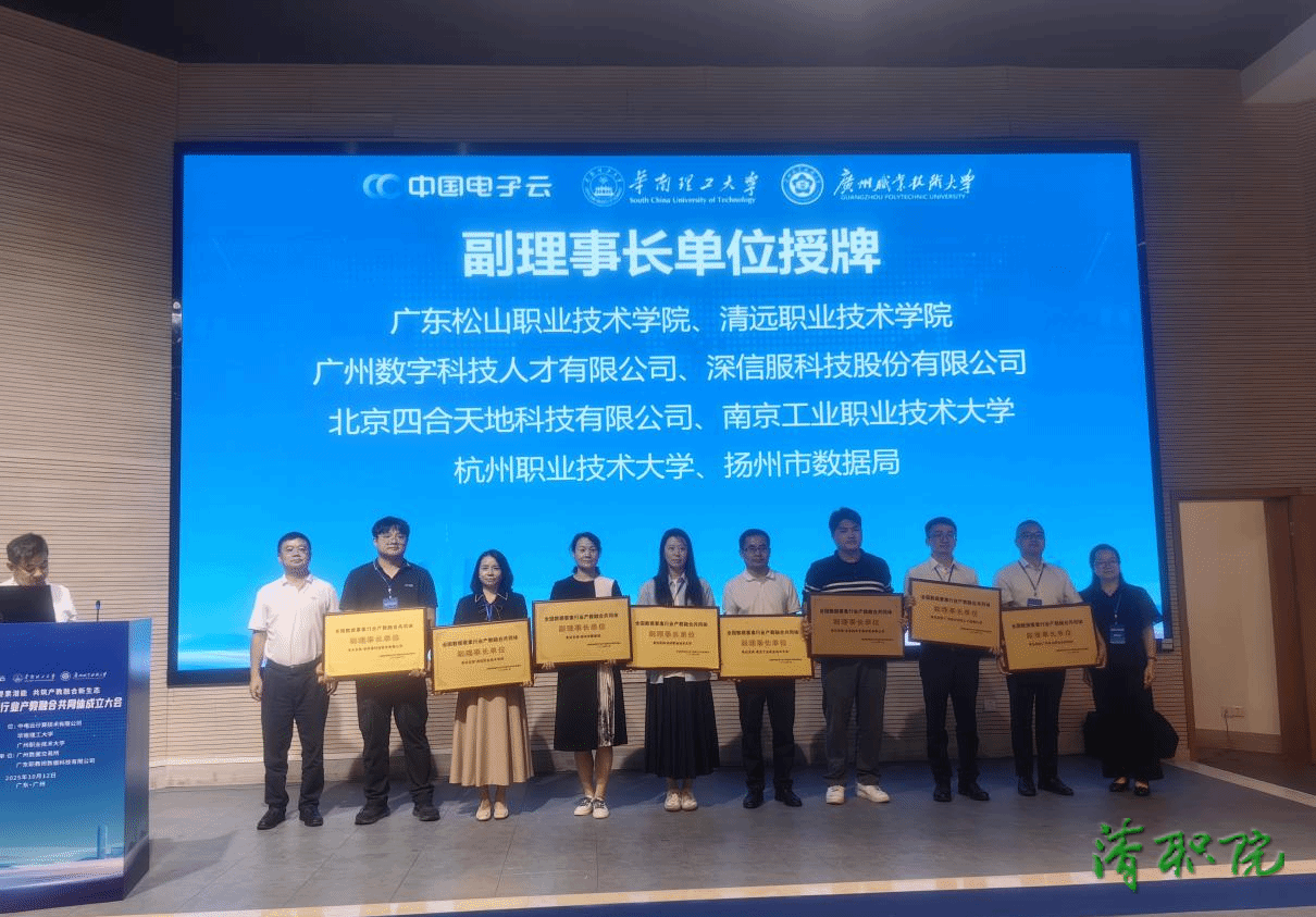▶清远职业技术学院副院长叶小玲(左三)参加副理事长单位授牌仪式现场