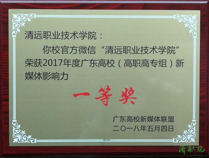 5月4日,在2018年广东高校新媒体联盟第三次全体理事大会暨“新时代,新使命,新作为”主题研讨会上,清远职业技术学院官方微信获颁“2017年度广东高校(高职高专组)新媒体影响力一等奖”荣誉牌匾。