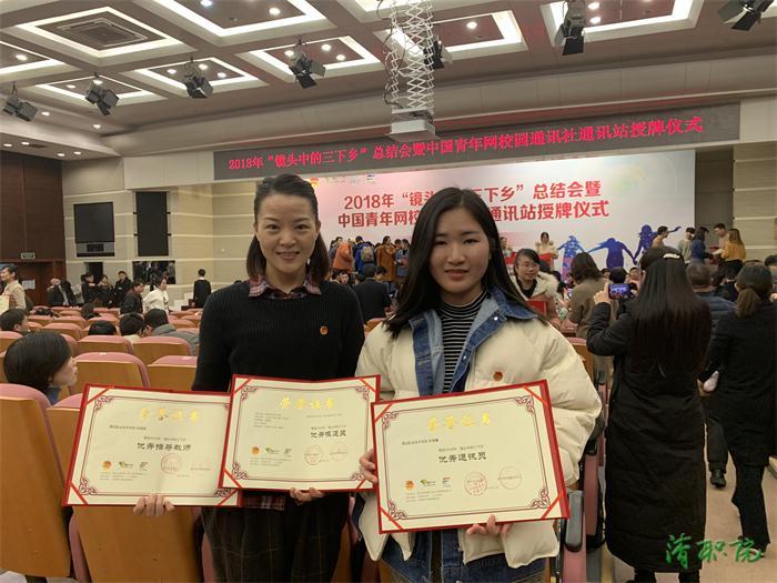 12月19日,由团中央学校部、团中央网络影视中心主办,中国青年网、对外经济贸易大学承办的2018年“镜头中的三下乡”总结大会暨中国青年网校园通讯社通讯站授牌仪式在北京对外经济贸易大学隆重举行。清远职业技术学院“故里乡情传非遗”宣传队在2018“镜头中的三下乡”表彰活动中荣获“优秀报道奖”奖,林倚菁荣获“优秀通讯员”奖,刘珊珊荣获“优秀指导教师”奖。