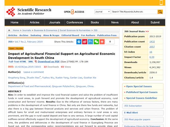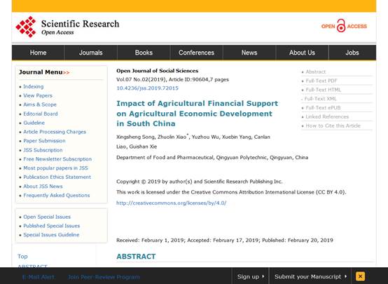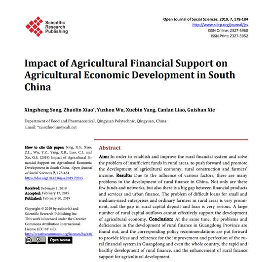 近日,食品药品学院学生宋星胜、吴宇洲、杨学斌、廖灿烂、谢桂珊参与撰写的论文《Impact of Agricultural Financial Support on Agricultural Economic Development in South China》在国际学术期刊《Open Journal of Social Sciences》上发表。论文对农业金融扶持与农业经济发展的关系进行了实证研究,并围绕华南地区农业金融扶持过程中存在的问题和不足提出相应政策建议,为完善农业金融体系和服务现代农业发展提供思路。这是清职院学生首次作为第一作者在国际学术期刊上发表论文,论文指导老师为食品药品学院辅导员肖卓霖。