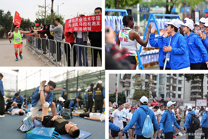 本届马拉松再次跑进清职院校园。为更好地服务比赛,学院领导和有关部门高度重视,赛前多次会议进行动员和安排部署,学院团委也对志愿者组织专题培训,做足了准备工作。比赛当天,参赛选手从学贤路跑进清职院,经环校路,入南门沿湖出西门环校一周,学院组织醒狮协会、动漫社、轮滑社等49个社团及二级学院学生沿途为选手助威。一路上锣鼓喧天,喝彩声加油声欢呼声此起彼伏,大家挥舞着双手与马拉松跑友互动,用最灿烂的笑容和各种热情时尚的方式欢迎四方宾客,为运动健儿们加油鼓劲,一起感受“清马”的激情与活力。选手们纷纷竖起大拇指为清职院的热情服务和优美环境点赞。