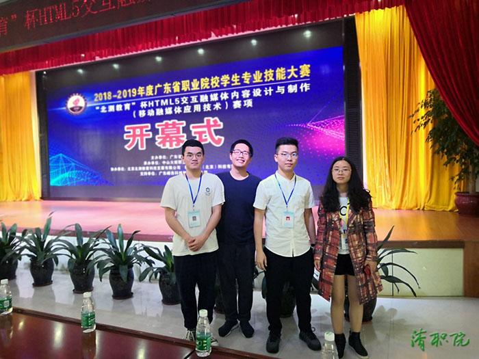 3月22日至23日,2018−2019年度广东省职业院校学生专业技能大赛“HTML5交互融媒体内容设计与制作”赛项在中山火炬职业技术学院举行。由信息技术与创意设计学院关丽霞、单红丽老师指导,2017级移动应用开发专业张志伟、付凯东、卢锦涛等三名学生组成的代表队在比赛中获得二等奖。