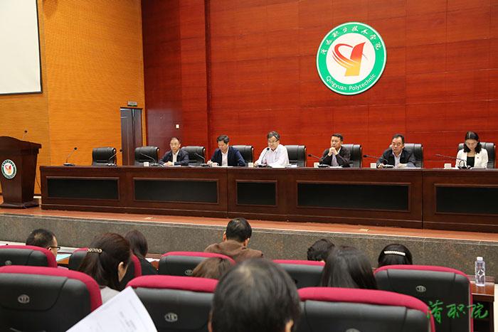 林海龙在讲话中就学院推进高水平职业院校建设、实现高质量发展提出四点意见。一是坚定正确的政治方向,全面加强党的领导和党的建设。深入学习习近平新时代中国特色社会主义思想和党的十九大精神,学习贯彻习近平总书记视察广东重要讲话精神,树牢“四个意识”、坚定“四个自信”、坚决做到“两个维护”。全面贯彻党的教育方针,坚持社会主义办学方向,落实立德树人的根本任务。二是启动“双高”建设,坚持走高质量发展之路。要坚持人才培养中心地位,推进人才培养模式改革,完善教育教学管理制度,推进课堂教学改革,提高学生的职业核心能力。对接省市重点产业、龙头企业,建设若干产教深度融合、人才培养质量高、社会认可度高的高水平专业(群)。要拓展专本对接试点专业,提升办学层次水平。要推进产教融合,协同育人。要加强内涵建设,完善教学管理制度。三是改善办学条件,打造优质办学平台。推进完善办学配套建设,落实办学经费保障,加强人才队伍建设。四是营造共建共治共享的现代大学治理格局。推进职称评审制度、绩效工资制度和“放管服”改革,为教师职业成长搭建更多教学、科研平台,充分调动并发挥教师在办学过程中的主体作用。