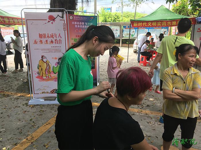 7月6日—7日,46支服务队集中到清城区大塱村下辖四个文化室开展服务活动,活动由垃圾分类行动宣传队、农村电子商务宣传队、“不忘初心,牢记使命”党的十九大精神宣传队、禁毒防艾反邪宣传队、医疗康复服务队、安全用电宣传队、义教服务队、食品、药品安全宣传队、中华传统文化宣传队、乡村特色产业调研等,每个服务点近50名师生参加,活动围绕学生所学、学生所能,通过发动群众参与,派发宣传单张,走进乡村的形式开展,受到当地百姓的欢迎。学生们表示,希望在今后的学习生活中继续走进乡村,用自己所学知识关注、服务乡村发展。