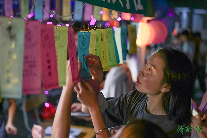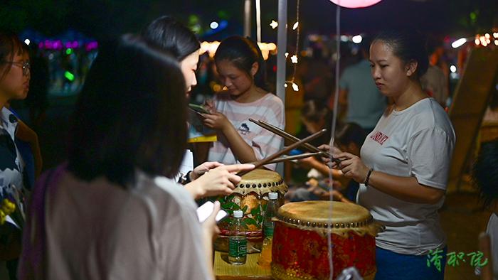 各学生组织和社团纷纷组织开展各种特色游园活动,有猜灯谜、制花灯、投壶等传统文化活动,也有吹乒乓球、即兴表演等互动游戏和才艺展示活动。同学们兴致勃勃前来参加活动,现场人潮涌动、热闹非凡,处处洋溢着欢乐、喜庆的节日氛围。许多2019级的新同学表示,这个中秋节虽然离开父母,但是并不觉得孤单,能和五湖四海的新同学在师兄师姐精心准备的游园活动中共度中秋佳节,感到很开心很有意义。