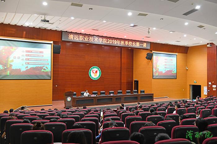 9月29日晚,清远职业技术学院院长胡刚在图书馆报告厅为2018级学生讲授“思政第一课”。400多名学生和思政部带队教师参加听课。