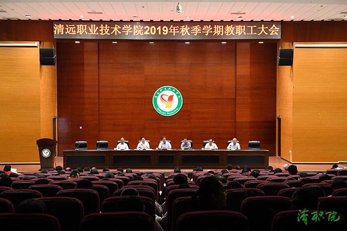 10月9日,清远职业技术学院在图书馆报告厅召开2019年秋季学期教职工大会,总结上学期主要工作成效,对新学期主要工作作出部署。学院党委书记林海龙,院长胡刚,党委副书记、纪委书记植新培,副院长陈景勇、许建、李生明和全体教职工参加会议,陈景勇主持会议。