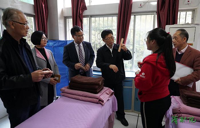 考察团听取汇报,参观校园,并到机电一体化技术实训室、医学美容技术实训室、阳宗易雷火灸产学研实训基地考察,与师生交谈,深入了解学生学习生活情况。唐豪对学院的校园环境、校园文化、办学理念和建设发展成果等给予高度评价,并向学院赠送了宋庆龄基金会纪念品。