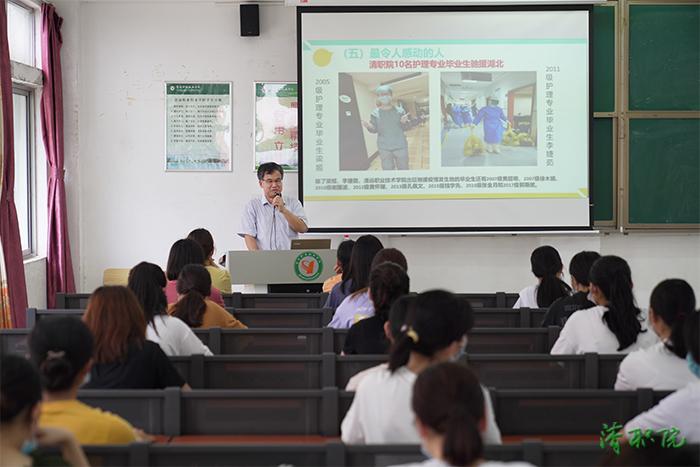 5月29日,清远职业技术学院2020年春季学期党委书记思政第一课开讲。林海龙书记以“学习抗疫英雄 担当时代使命”为主题,给返校复学学生上了“思政教育第一课”。护理学院、思政部教师和护理学院60多名学生代表参加听课。